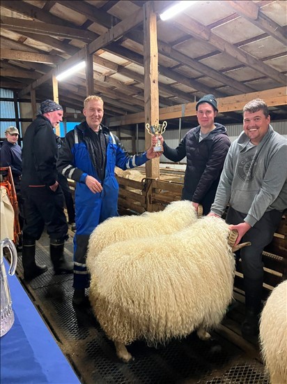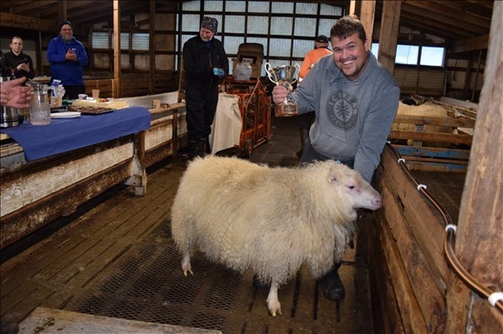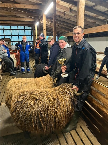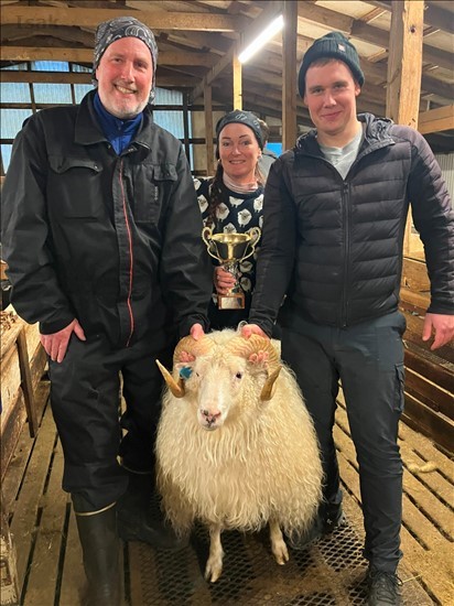 hér er Emil að taka á móti bikarnum fyrir besta kollótta hrútinn 2025.