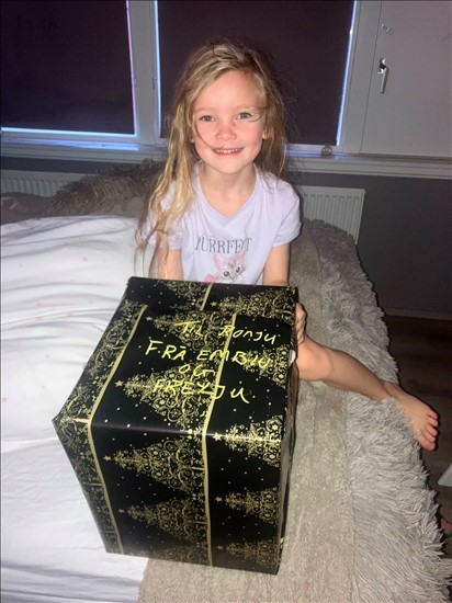 Hún var vakin um morguninn með pakka frá systkynum sínum sem var playmobile hús.