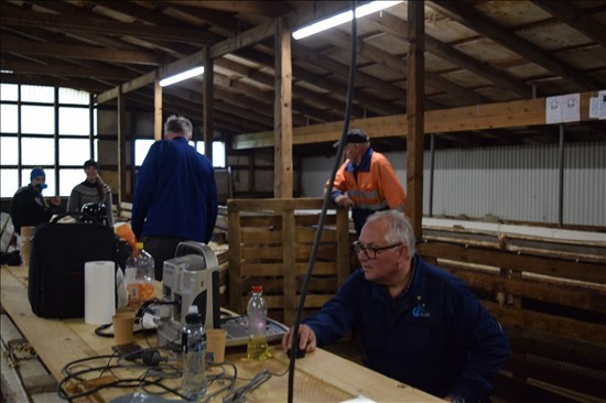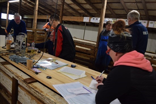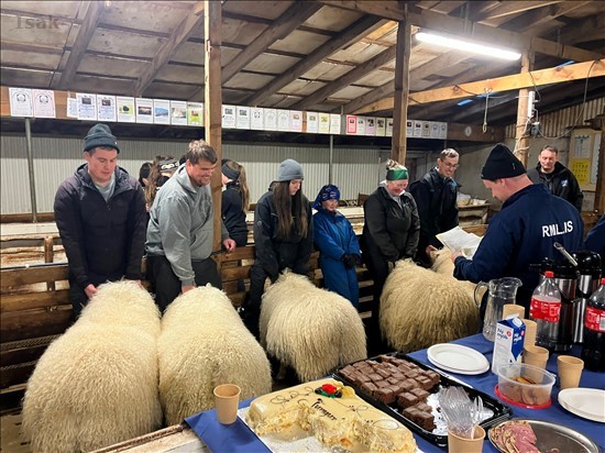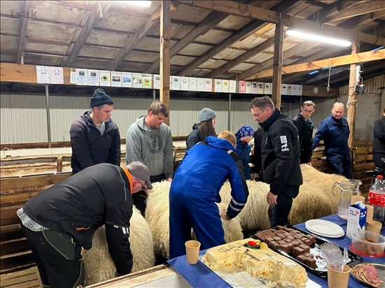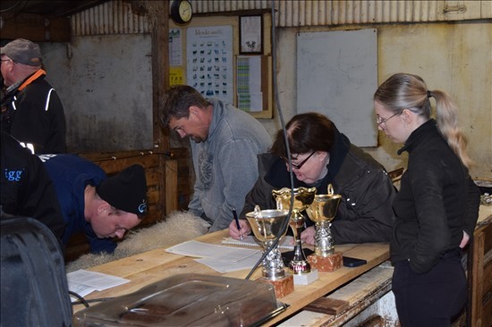 Hér er verið að þukkla hvítu hyrndu hrútana og bera saman við mat dómarana.