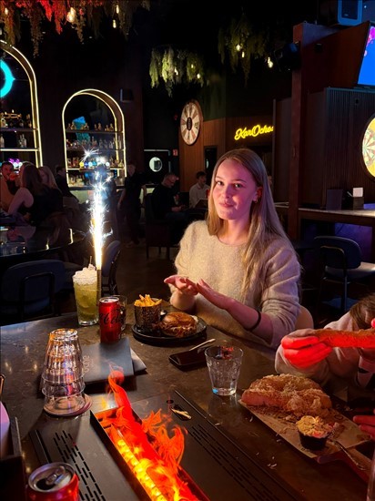 hér erum við út að borða og hún fékk smá glaðning með blysi í tilefni þess að vera 15 ára .