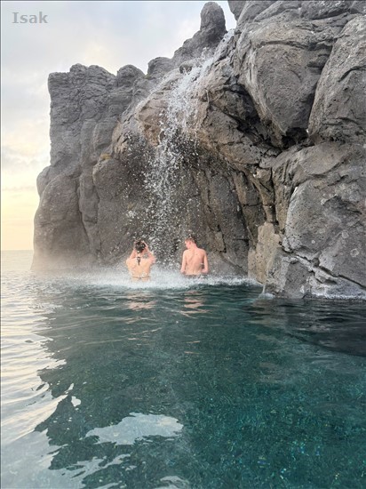 Embla og Benóný undir fossi sem kemur niður klettana mjög flott.