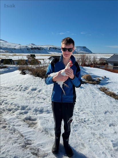 Benóný að passa hænurnar fyrir Freyju ömmu og afa Bóa en þau fóru til Spánar.